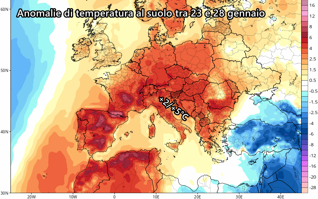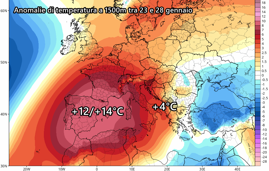 Questo assetto barico causerà inevitabilmente pesanti anomalie ad ovest, tra la penisola iberica, Francia meridionale, le Baleari e il nord Italia. La previsione delle anomalie a 1500 metri tra 23 e 28 gennaio è davvero clamorosa: sui settori appena menzionati si prevedono fino a 14°C oltre le medie del periodo a circa 1500 metri di altezza. In pratica parliamo di temperature tardo primaverili che non hanno nulla a che vedere col mese di gennaio.