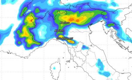 dopo una relativa fase di stasi, siamo prossimi ad essere interessati da una fase atmosferica alquanto dinamica, nella quale troveranno spazio lo sviluppo di corpi nuvolosi accompagnati da precipitazioni che saranno nevose fino a bassa quota. La prima perturbazione, quella che ci interesserà nell’immediato futuro, già a partire dalle prossime ore, porterà precipitazioni nevose fino a bassa quota sulla dorsale appenninica centrale e settentrionale, la notte tra Natale e Santo Stefano i fiocchi potrebbero spingersi fino a quote prossime la pianura sull’Emilia-Romagna. La seconda perturbazione sarà più intensa ma verrà accompagnata anche da aria più mite, porterà intense precipitazioni al nord e su parte del centro nella notte tra domenica 27 e lunedì 28 dicembre. Ci aspettiamo in questa sede anche delle nevicate fino a quote pianeggianti su est Piemonte, Lombardia ed alto Veneto. Ecco le precipitazioni nevose previste dal modello LAMMA per la mattinata di lunedì: