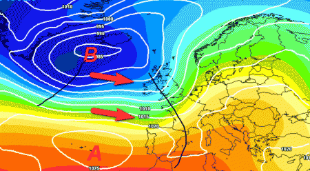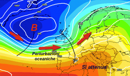 Anche qui si notano due perturbazioni all’attacco dell’alta pressione, che verrà molto marginalizzata verso sud in direzione del nord Africa.