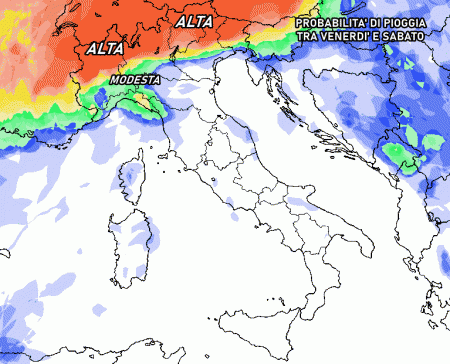 L’instabilità sarà molto più frequente nei giorni di venerdì e sabato, riuscendo ad estendersi in modo disorganizzato anche su Friuli, Emilia Romagna e zone interne di Toscana, Abruzzo, Marche, Umbria, Molise, Basilicata.