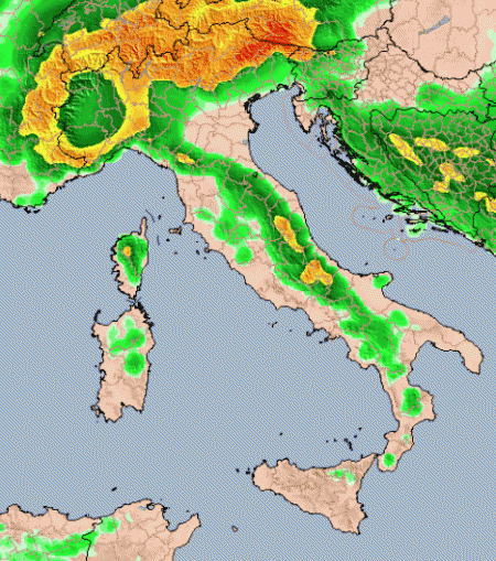 In verde gli accumuli più modesti tra 1 e 5cm, con il giallo invece si arriva ai 10cm, con il marrone si va oltre, giusto per una comprensione sommaria della mappa, ma se analizzassimo le carte ogni 6 ore, capiremmo davvero come il freddo giusto per ospitare la perturbazione sia destinato a rimanere solo sul nord-ovest e sull’arco alpino, mentre il respiro tiepido di Libeccio ed Ostro ne determineranno la trasformazione in pioggia dalla Lombardia centrale verso est sulle pianure.