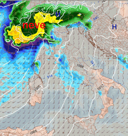 Tra le 00 e le 06 ecco la massima estensione della nevicata con fiocchi generosi su Appennino ligure, Lombardia occidentale, discretamente generosi sul resto del nord-ovest, ma neve si prevede anche su est Lombardia, alto Veneto, Val d’Adige, Friuli Venezia Giulia, arco alpino, mentre sulla Romagna e l’est dell’Emilia si avrà una sorta di "sottovento appenninico" senza fenomeni, pioggia sulla costa ligure: