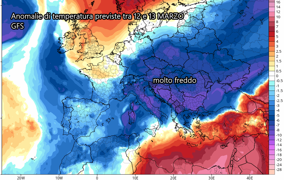 Qualora dovesse realizzarsi lo scenario proposto dall’americano GFS, anche l’Italia vivrebbe un sensibile raffreddamento tra 12 e 13 marzo. Ovviamente sono soltanto ipotesi a lungo termine, ma una cosa è certa: tra le tante variabili meteorologiche della prima metà di marzo si inserirà l’anticiclone scandinavo ed il gelo sull’est Europa. Nei prossimi giorni il quadro sarà molto più chiaro, pertanto ci ritorneremo con editoriali più approfonditi.