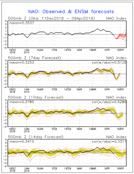 Continuerà anche nei prossimi giorni il pattern cosiddetto di NAO (North Atlantic Oscillation) di segno NEGATIVO. Questo tipo di circolazione impone la presenza di alcuni forti anticicloni collocati alle latitudini settentrionali, i quali agevolano lo sviluppo di complesse situazioni di bassa pressione alle latitudini del Mediterraneo. Ebbene nel prossimo futuro tale situazione determinerà diverse occasioni di pioggia anche per il nostro stivale, con un apice di maltempo in chiave fredda primaverile nel prossimo fine settimana. Ecco l’andamento e la previsione dell’indice NAO dallo scorso dicembre sino ad oggi; dopo un lunghissimo periodo di segno positivo, in questo mese di aprile scendiamo nel segno negativo: