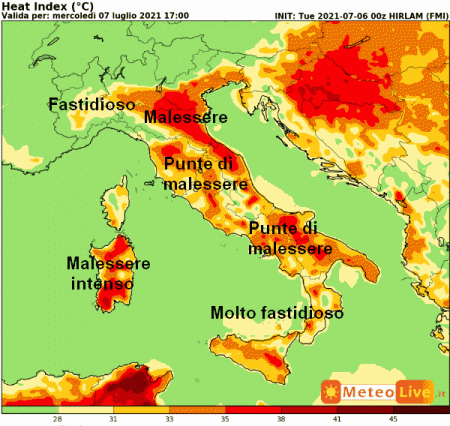 In questa sede monitoreremo l’indice di calore che si avrà in Italia nelle giornate di mercoledi 7 e giovedi 8 luglio. Si legga a tal proposito questo articolo: www.meteolive.it/news/In-primo-piano/2/pillole-meteo-che-cos-l-indice-di-calore-/90917/