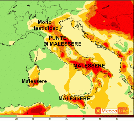 Condizioni di MALESSERE saranno presenti su tutto il meridione, Sicilia compresa, ad eccezione forse delle aree costiere. Punte di MALESSERE si registreranno anche sulla Sardegna Meridionale e nelle zone interne dell’Italia centrale; al nord caldo MOLTO FASTIDIOSO specie sulla Val Padana centro-orientale.