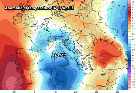 Difatti la previsione sulle anomalie medie tra 14 e 19 aprile ci mostra un clima più freddo del normale su gran parte d’Italia, in particolare al sud. Possiamo notare fino a 3-4°C al di sotto delle medie termiche di Aprile, mentre al nord resteremo in media col periodo.