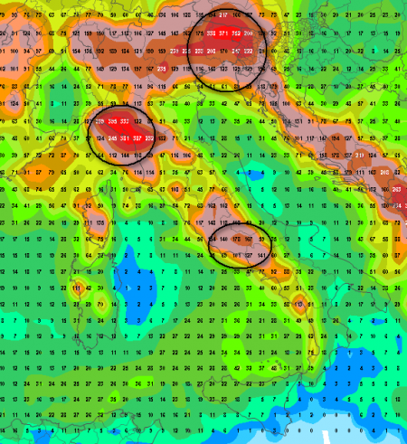 Il bilancio è quello che vediamo qui sotto, decisamente INQUIETANTE, da notare oltre alle zone citate, anche le abbondanti precipitazioni (qui meno pericolose) attese sul Lazio e in genere tra Lombardia, Trentino e Veneto, mentre i 300mm ed oltre che si prevedono tra Liguria di Levante, alta Toscana ed estremo nord-est, fanno decisamente PAURA!