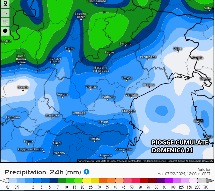 L’apice di questa instabilità arriverà tra la giornata di domenica e il pomeriggio di lunedì. Ci aspettiamo l’arrivo di temporali prima sulle Alpi occidentali domenica pomeriggio-sera, come visto in questo articolo, e poi anche sul nord-est sul finire della giornata di domenica. Questi fenomeni, generalmente isolati, sul Triveneto saranno concentrati su Alpi e Prealpi, come si evince anche dagli accumuli pluviometrici stimati fra pomeriggio di domenica e notte su lunedì.