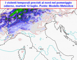 Nella giornata odierna, martedì 12 luglio, già alcuni temporali hanno interessato Piemonte, Lombardia e Trentino Alto Adige. Altri ne arriveranno in serata. I sistemi temporaleschi in questione saranno ancora inseriti in un contesto PREFRONTALE, il fronte freddo vero e proprio sarà infatti ancora confinato al di là delle Alpi occidentali.