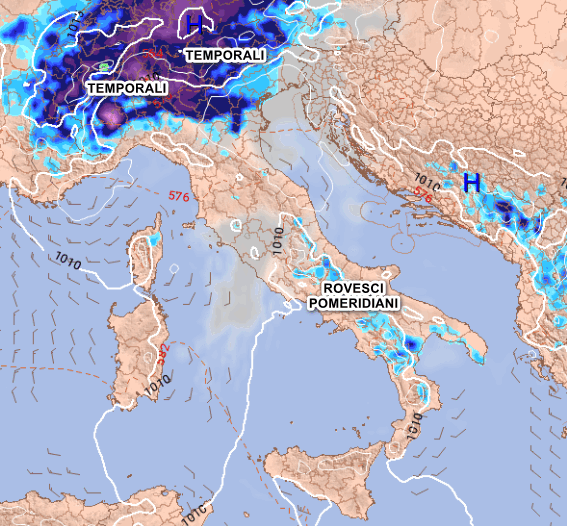 Secondo le mappe odierne, sembra possibile un passaggio temporalesco sulle aree poste a nord del Po, con i fenomeni che dalle Alpi potrebbero sconfinare verso le sottostanti pianure. Qualche rovescio o breve temporale pomeridiano sarà possibile anche lungo la dorsale appenninica centro-meridionale, ma senza velleità sconfinanti verso le coste.