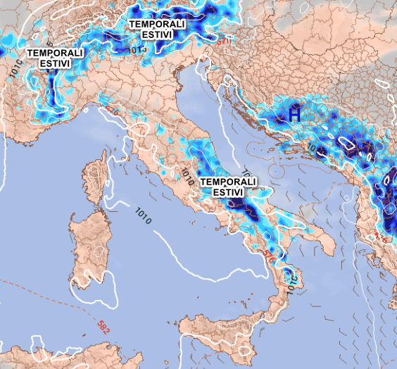 Oltre ai temporali pomeridiani sulle Alpi, con scarso coinvolgimento delle pianure sottostanti, compariranno temporali estivi pomeridiani anche lungo la dorsale appenninica centro-meridionale, senza però sconfinare lungo le coste, se non in maniera molto attenuata. Sul fronte del caldo, sarà sempre molto intenso, ma con qualche grado in meno specie nelle aree raggiunte dai temporali.