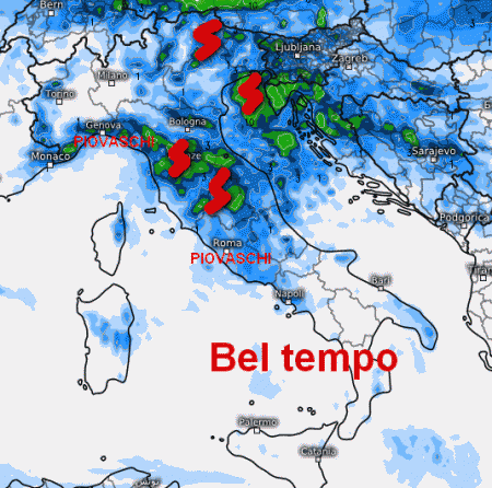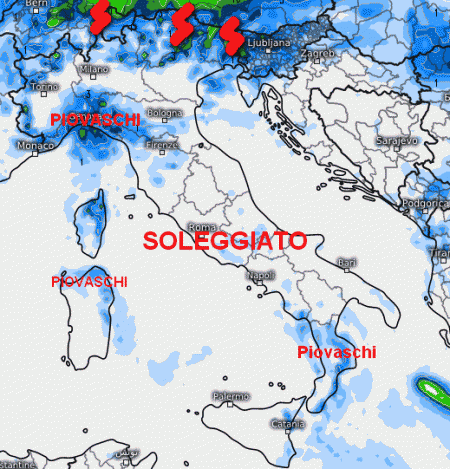 Qualche piovasco, raramente temporalesco, è atteso al mattino sulla Liguria, in estensione anche al basso Piemonte. Piovaschi locali anche nel nord della Sardegna e sulla Calabria.