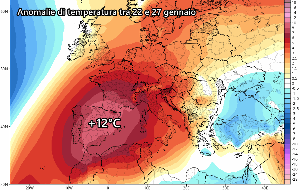 Notevoli le anomalie previste su un arco temporale di ben 5 giorni, tra 22 e 27 gennaio. Le anomalie più gravi le troviamo su Portogallo, Spagna e Francia, con punte di 12°C al di sopra delle tipiche medie del periodo. Anomalie anche in Italia, specie al nord, dove si prevedono fino a 7-8°C oltre le medie.