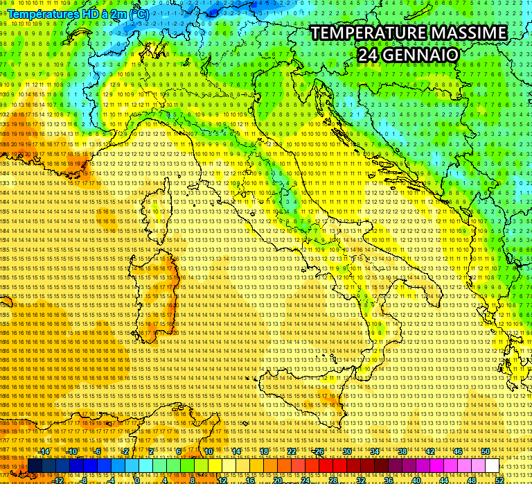 Le anomalie peggiori saranno registrate in alta quota, dunque in montagna. In pianura e nelle valli prevarranno le inversioni termiche, che favoriranno temperature più basse, nebbie e nubi basse. Laddove splenderà il Sole la colonnina di mercurio potrebbe anche superare i 15-16°C, come si evince da questi valori previsti il 24 gennaio.