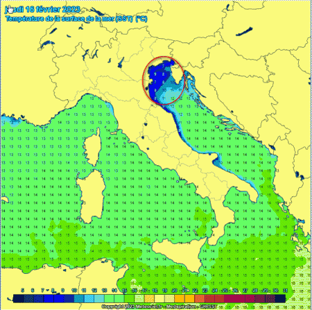 La palma del freddo spetta ai Golfi di Trieste e Venezia, con circa 7-8° di temperature superficiale. Freddo anche l’alto Adriatico con 10-12° di temperatura superficiale. Il resto dei bacini presenta una temperatura compresa tra 13 e 15°.