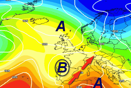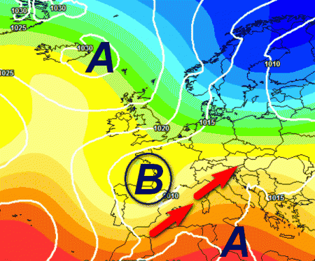 Le correnti meridionali di richiamo (frecce rosse) potrebbero portare le prime piogge al nord durante il prossimo week-end, mentre al centro e soprattutto al meridione l’alta pressione potrebbe mollare la presa solo successivamente.