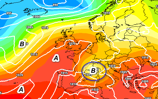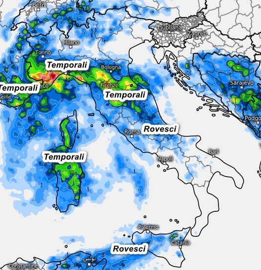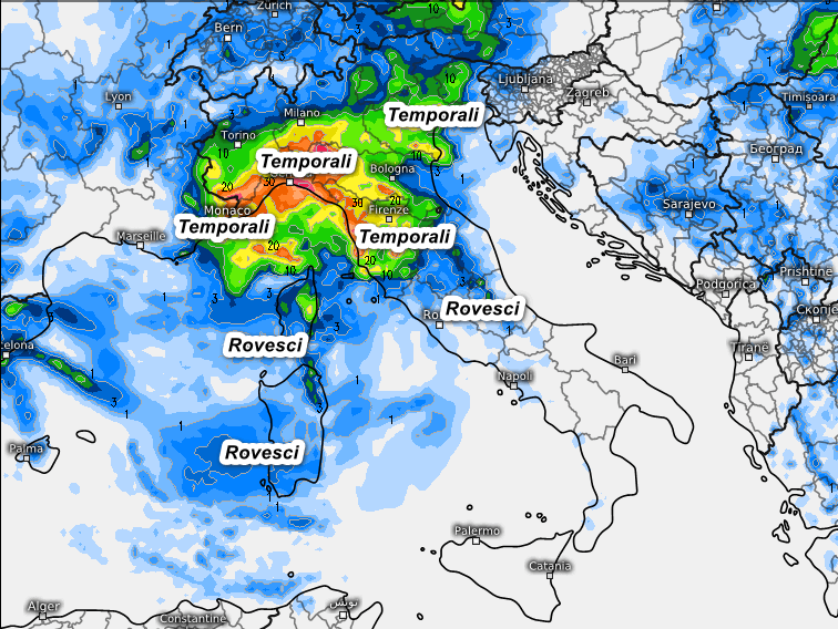 Secondo le mappe odierne, il nucleo instabile sembra centrarsi sulla Costa Azzurra, una posizione ottimale per avere rovesci e temporali su gran parte del settentrione e del centro. I fenomeni saranno accompagnati anche da una generale diminuzione delle temperature che si farà sentire anche sulle regioni meridionali.
