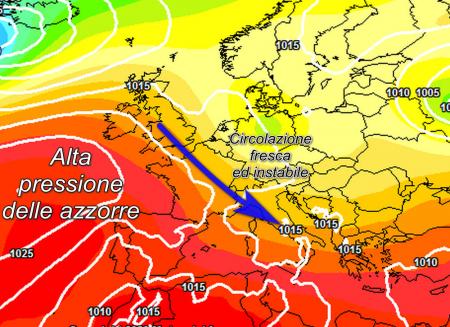 La terza settimana di luglio che idealmente potrebbe rappresentare il cuore vero e proprio dell’estate, potrebbe trascorrere con una circolazione tutt’altro che anticiclonica; infatti a livello sinottico stanno comparendo un po’ all’ultimo minuto delle novità che prima non erano state valutate soprattutto da parte dei modelli americani. Infatti il lungo il fianco orientale dell’alta pressione delle Azzorre, una circolazione di aria più fresca nord-atlantica, riuscirà a far breccia sull’Europa centrale e poi sul Mediterraneo, nella seconda metà della settimana. Un vortice di aria fresca in quota sarà collocato a poca distanza dal nostro Paese, per la precisione sulla penisola balcanica. All’interno del vortice sarà presente un modesto quantitativo di aria fredda in quota, con una temperatura approssimativa di -15°C/-16°C all’altezza di circa 5500 metri.