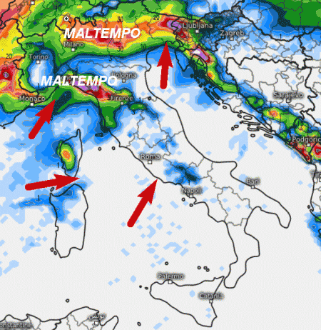 Maltempo con rovesci tra alta Lombardia, Triveneto, Liguria centro-orientale ed alta Toscana. Neve solo oltre i 1300-1400 metri sulle Alpi. Venti in rotazione ed in rinforzo da Libeccio sul Mar Ligure e l’alto Tirreno con mari in condizioni non ottimali. Sul resto della Penisola tempo asciutto e mite anche se non mancherà qualche piovasco sulla Sardegna e sul Lazio.