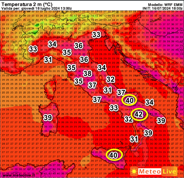 Ritroviamo punte di 42° sulla Lucania, 40° in Sicilia e nel Foggiano, 39° sulla Sardegna, il Salento e la Calabria Ionica, ma punte di 37-38° saranno probabili su gran parte d’Italia, ovviamente nelle pianure interne più distanti dal mare.