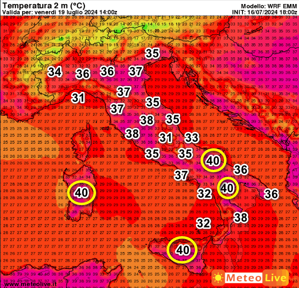 Ancora 40° su Sardegna, Sicilia, Lucania e Foggiano, ma osservate quante regioni italiane avranno temperature oltre i 35° con punte frequenti di 37-38°. Si raccomanda di non uscire nelle ore più calde specie per anziani, bambini e soggetti con problemi respiratori. Chi è in vacanza, eviti l’esposizione al sole nelle ore centrali della giornata.