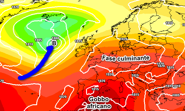Si tratta della fase culminante dell’alta pressione sul Mediterraneo e sul nostro Continente. In prossimità del nord Africa è visibile il quartier generale della canicola con la classica “gobba” che si protende fino alle Baleari, sfiorando la Sardegna. Con questa situazione, la canicola sull’Italia subirà un giro di vite, portando valori di CALDO INSOPPORTABILE da nord a sud.