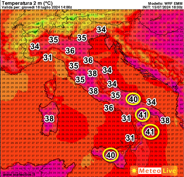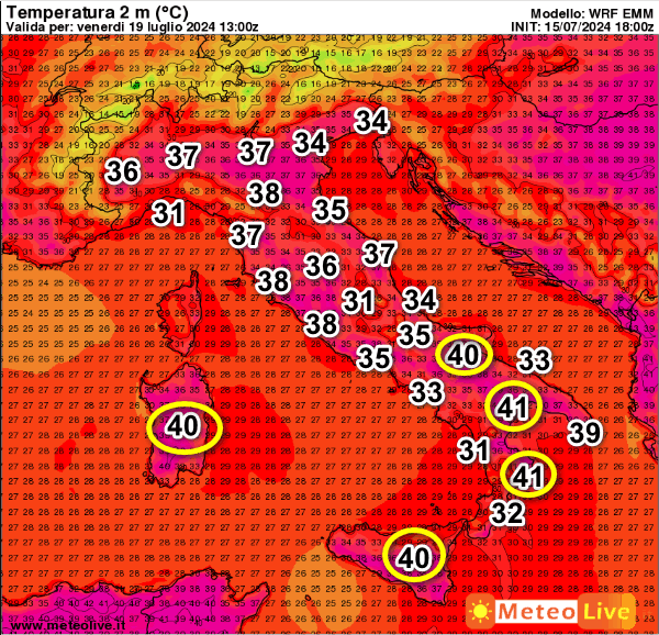 41° sempre sulla Calabria Ionica e la Lucania, 40° su Sardegna, Sicilia e Foggiano. Quasi tutte le aree interne avranno valori oltre i 35° con punte di 37-38° diffuse su gran parte del territorio nazionale, compreso il settentrione.