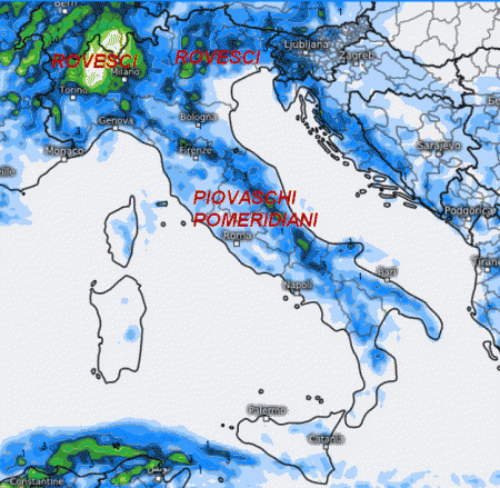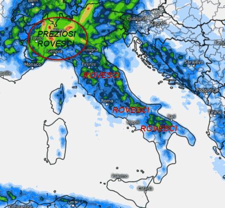 PREZIOSI ROVESCI tra Piemonte e Lombardia talora intensi, ma come vedete dalla mappa, pioverà praticamente su tutto il settentrione, anche al nord-est. Sembrano davvero poche (al momento) le aree a "rischio" di ricevere poco. Rovesci o brevi temporali si faranno vedere anche nelle aree interne del centro-sud specie nelle ore pomeridiane. Tempo invece più stabile sulle due Isole Maggiori ed estremo sud: