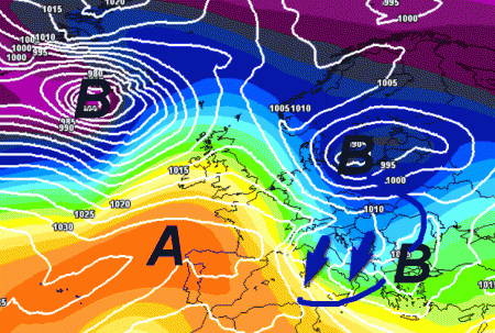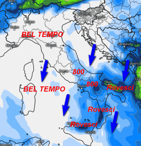 Le correnti si disporranno da nord, quindi arriverà aria più fredda. Piovaschi sparsi saranno presenti sul medio Adriatico e al meridione, specie su Puglia, Calabria e nord Sicilia. Quota neve in Appennino tra 800 e 1000 metri.