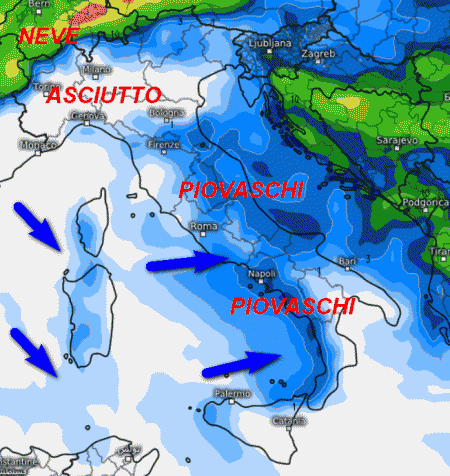 Piovaschi sparsi, che daranno comunque scarsi accumuli, potrebbero verificarsi nelle aree interne del centro, sul medio Adriatico e tra la Campania e la Calabria Tirrenica, il tutto accompagnato da forti venti tra ovest e nord-ovest non ancora freddi.