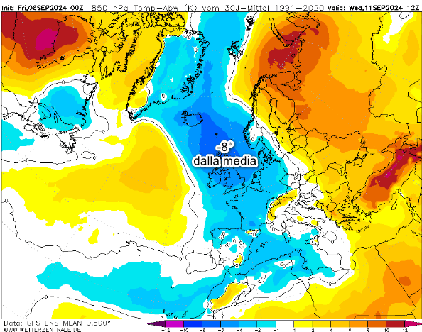 La “lingua fresca” si estenderà e si strutturerà ulteriormente portando termiche fino a 8° inferiori alla media in sede inglese. Notate come l’aria fredda entrerà anche sul Bacino occidentale del Mediterraneo: un viatico non bello per la costruzione di intensi sistemi temporaleschi in seno agli specchi di mare ancora pesantemente surriscaldati.