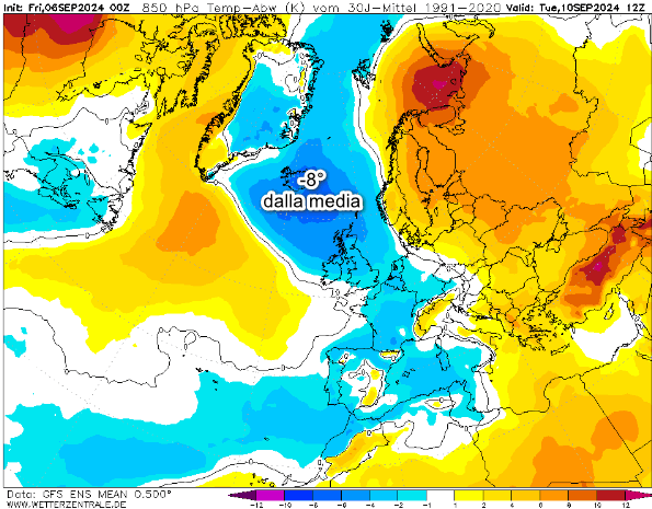 La prima mostra le anomalie termiche a 1500 metri attese in Europa nelle ore centrali di martedi 10 settembre: