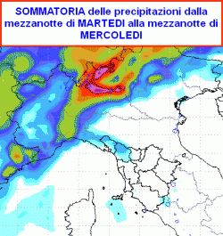 La sommatoria delle precipitazioni del modello lamma ( dalla mezzanotte di martedì alla mezzanotte di mercoledi) ci mostra piogge di un certo peso tra la Lombardia, l’alto Veneto, il Trentino e la Liguria centrale.