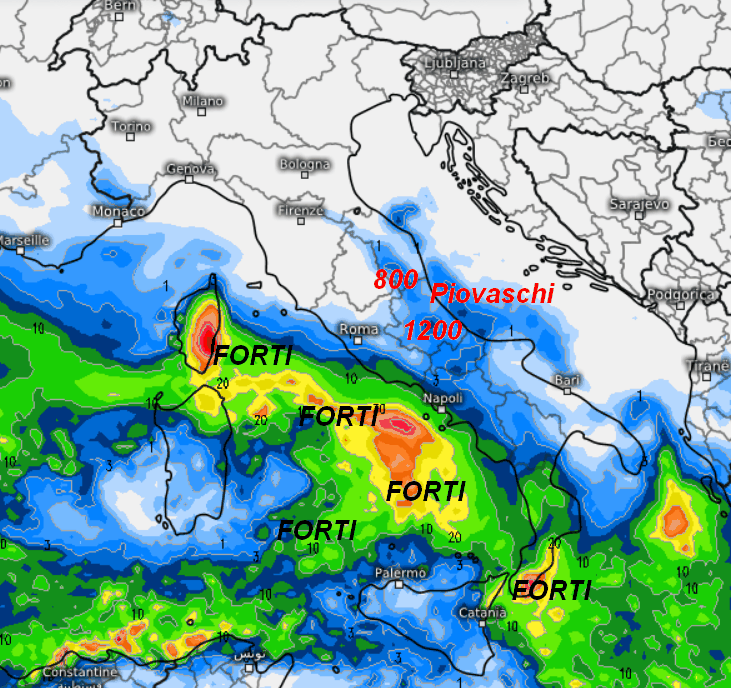 Rovesci anche intensi sulla Corsica, la Sardegna settentrionale, la Sicilia orientale e il sud della Calabria. Qualche pioggia anche sulla Campania e il basso Lazio, ma il grosso dei fenomeni sarà ubicato in mare aperto. Qualche piovasco possibile sul medio Adriatico con residue nevicate oltre gli 800 metri, ma con quota neve in rialzo, per il resto tempo asciutto e progressivamente più mite.