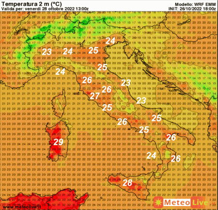 La prima mappa mostra le temperature attese in Italia nell’arco della giornata di venerdi 28 ottobre