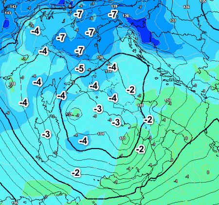 Il nocciolo freddo con isoterme attorno a -6/-7° a 1500 metri si porterà verso le regioni centrali, mentre le temperature tenderanno a calare anche al meridione e sulle Isole. Qualche grado in più è previsto invece al nord, specie sul nord-ovest.