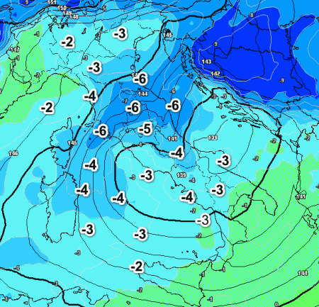Il nocciolo più freddo sarà presente al nord-est, dove avremo isoterme a 1500 metri comprese tra -6 e -7° e con temperature al suolo presumibilmente attorno allo zero. Tutta l’Italia sarà comunque abbracciata da temperature negative alla medesima quota, con l’isoterma 0° a 1500 metri che potrebbe spingersi fino alle regioni estreme meridionali.