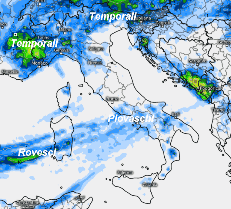 I temporali più forti si sposteranno al nord-ovest, specie sul Piemonte, anche se qualche fenomeno temporalesco non sarà escluso sul restante settentrione, specie sul Triveneto. Qualche rovescio o temporale a base alta sarà presente tra la Sardegna e le coste del basso Tirreno, ma con accumuli scarsi, per il resto tempo variabile, con belle schiarite e basso rischio di fenomeni.