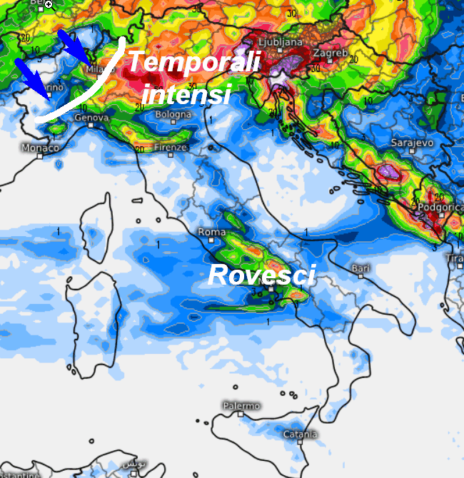 I primi temporali organizzati saranno presenti su alcuni settori del nord già nella giornata di domani, ma sarà tra venerdi e sabato che il maltempo darà il peggio di se su queste aree, estendendosi in parte ad alcuni settori del centro-sud.