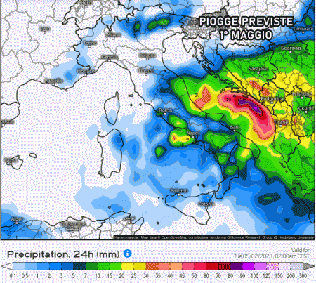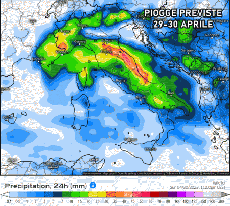 Secondo il centro di calcolo americano GFS l’appena citata perturbazione potrebbe raggiungere il nord già da sabato 29 Aprile con al seguito rovesci e temporali. Nella giornata successiva il maltempo attraverserebbe tutte le regioni centrali con temporali anche intensi, con accumuli sostanzioni come possiamo notare tra Emilia Romagna, Marche, Abruzzo, Molise e Toscana.