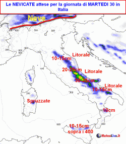 La cartina che vedete inquadra la sommatoria dei fenomeni nevosi attesi in Italia tra le 7 e le 19 della giornata di MARTEDI 30 DICEMBRE. Oltre a confermare i fenomeni nevosi dalla Romagna verso sud, abbiamo indicato le zone dove la coltre nevosa risulterà più abbondante. 10-15cm sono attesi sull’Appennino Marchigiano, 25-35cm su quello Abruzzese e Molisano, 20cm sulla Puglia Garganica, 10-15cm nelle zone interne della Puglia, in prossimità del Crotonese, in Calabria e in Irpinia. Sulla Sicilia settentrionale (Madonie, Nebrodi, Peloritani) fino a 10-15cm, con fiocchi fino a 400 metri, occasionalmente però anche a quote inferiori in caso di rovesci intensi.