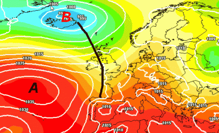 Si nota chiaramente il calo della pressione e dei geopotenziali sull’Italia stante il ritiro del braccio orientale dell’alta pressione delle Azzorre che tenderà a pavoneggiarsi in Atlantico. Tutto ciò determinerà un aumento dell’instabilità sull’Italia che a seguire potrebbe sfociare in tempo perturbato tra venerdi e sabato, stante l’avanzata della perturbazione sull’Europa occidentale.