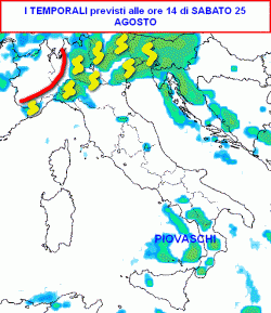 Alle ore 14 di sabato 25 agosto i temporali interesseranno parte della Liguria, la Lombardia, l’Emilia e il nord-est dove si prevedono i fenomeni più intensi e localmente accompagnati dalla grandine.