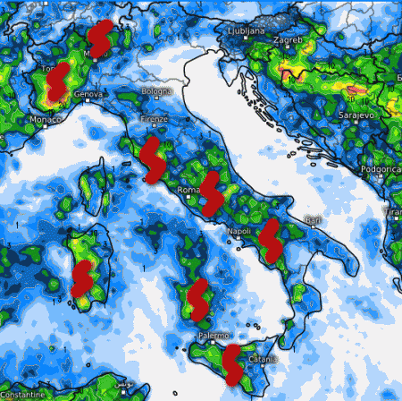 Instabilità sull’Italia in aumento! Come vedete, compariranno nuclei temporaleschi anche sul mare, ovviamente nelle ore notturne; per il resto i temporali saranno spesso arroccati alle aree interne e montuose nel pomeriggio. Fenomeni praticamente assenti solo sull’Emilia Romagna e lungo il versante adriatico.