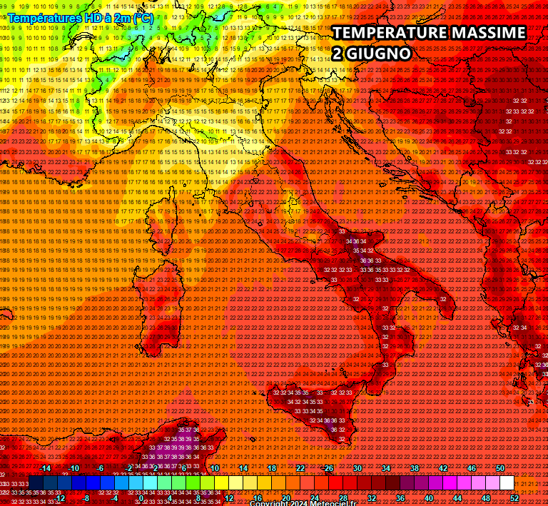 In effetti, il meridione si ritroverà sotto un flusso d’aria calda richiamata da questa depressione posizionata sul centro Europa, che inevitabilmente farà impennare le temperature e porterà anche condizioni meteo decisamente più stabili. Respireremo aria da piena estate su gran parte del Sud, nonostante la presenza di qualche moderata raffica di scirocco e un po’ di polvere desertica che andrà a sporcare i nostri cieli. Le temperature saliranno vertiginosamente fino a superare i 30 °C su tante città del meridione, dalla Puglia alla Sicilia, con punte localmente superiori ai 33 o i 34 °C. Insomma, ne verrà fuori una giornata praticamente da piena estate e, perché no, anche da mare. Invece le temperature saranno nettamente più basse, come possiamo osservare nella mappa seguente.