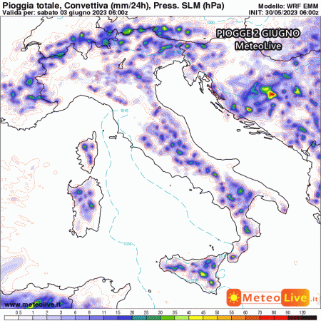 Il modello americano GFS, nel suo aggiornamento serale, ci mostra chiaramente il rischio di piogge e rovesci nel corso del 2 Giugno. In verde e giallo possiamo notare accumuli degni di nota, attorno ai 10-15 mm, frutto di rovesci e temporali che si svilupperanno nei settori interni principalmente su Alpi e Appennino.
