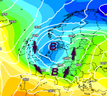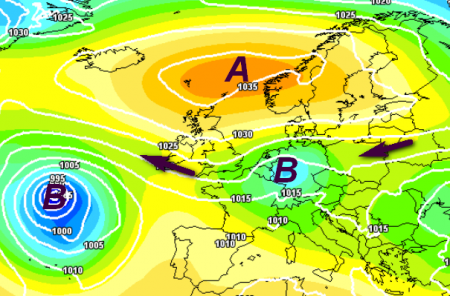 Tutti vogliono sapere se pioverà durante il ponte del 25 aprile. Stamane i modelli hanno virato almeno parzialmente verso questa soluzione, rinnovando l’instabilità che già si manifesterà durante questa settimana e che deriva dall’inserimento di correnti orientali fresche ed instabili che scorreranno al di sotto dell’anticiclone scandinavo, come si vede molto bene dalla mappa qui sotto: