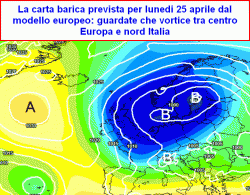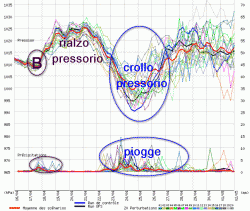 Si noti qui a fianco il notevole calo pressorio previsto sull’Italia da venerdì 22 in poi con associate precipitazioni.
