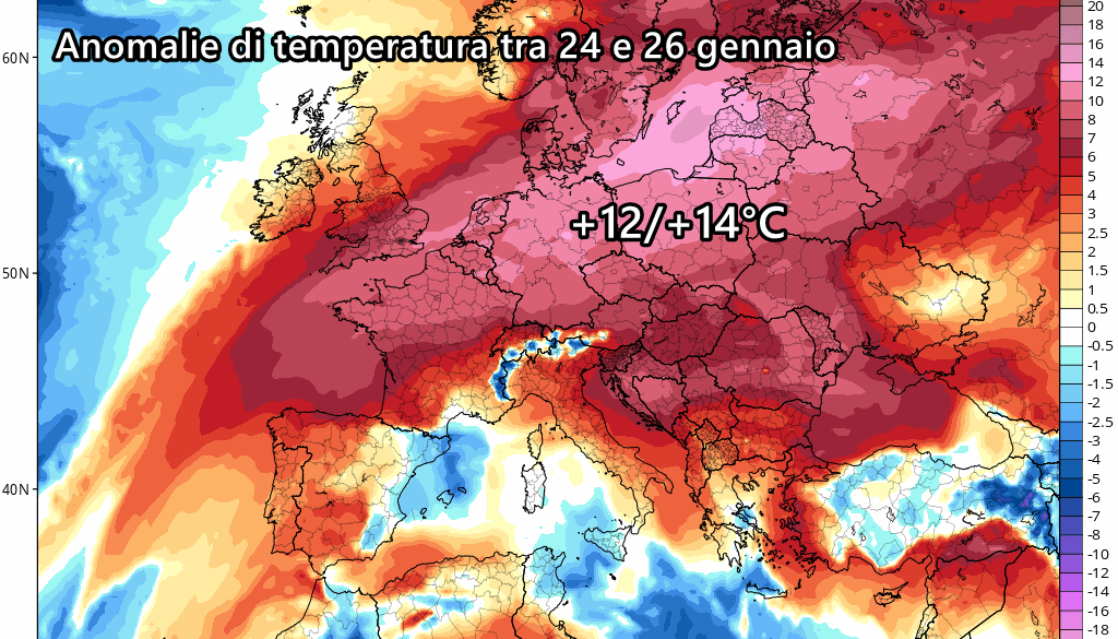 Davvero clamorose le anomalie previste dal modello americano GFS tra 24 e 26 gennaio! Su tutta l’Europa centro-orientale la colonnina di mercurio schizzerebbe verso l’alto, addirittura di ben 12-14°C oltre le medie del periodo. Anomalie leggermente più contenute in Italia, ma pur sempre poco consone all’inverno.